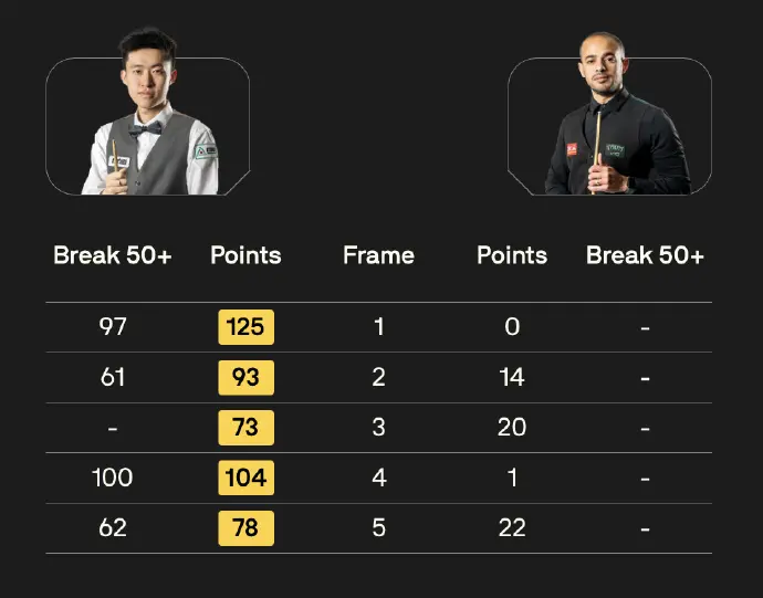 其他几场比赛,雷佩凡以5-0横扫米哈乌-苏巴尔奇克、国强以5-4险胜阿米尔-萨克霍什、徐思以5-1轻取马哈茂德-埃尔-哈雷迪、张家玮以5-3战胜吉米-罗伯逊、姚朋成以5-3战胜本-沃拉斯顿。