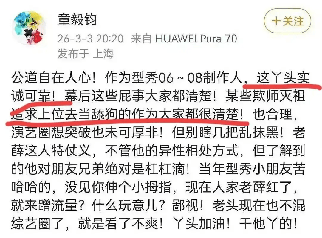 《我型我秀》的制作人童毅钧更是直接开腔,说有些人“欺师灭祖、舔狗上位”。